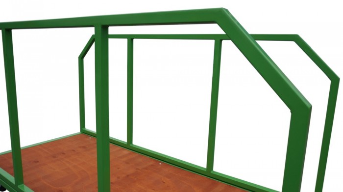 - платформа изготовлена из водостойкой фанеры - четыре пневматические колеса - два поворотных колеса с тормозами для легкого перемещения - съемные боковые поручни - тележка полностью разборная для облегчения транспортировки и монтажа