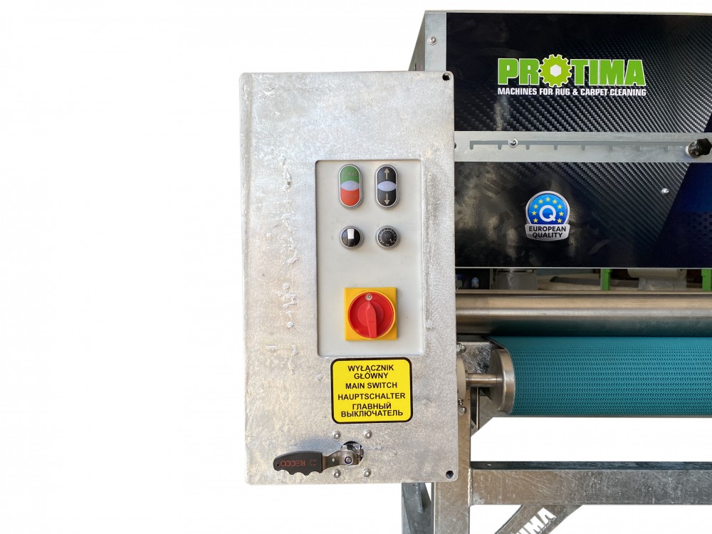 Автомат оснащен очень простой и интуитивно понятной главной панелью управления, расположенной с левой стороны машины. Секции чистки и стирки оснащены датчиками, которые регулируют рабочий диапазон в зависимости от ширины ковра.